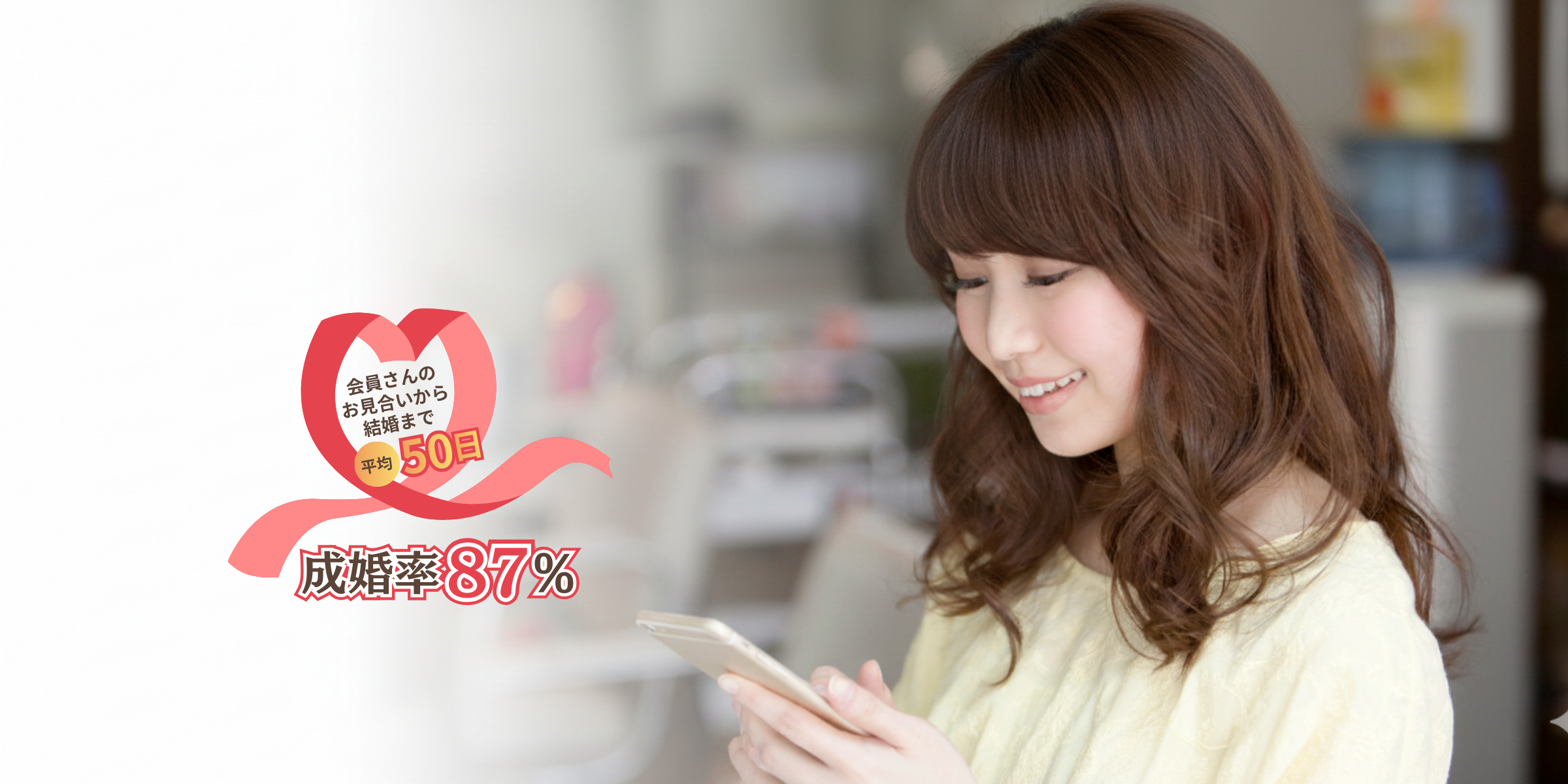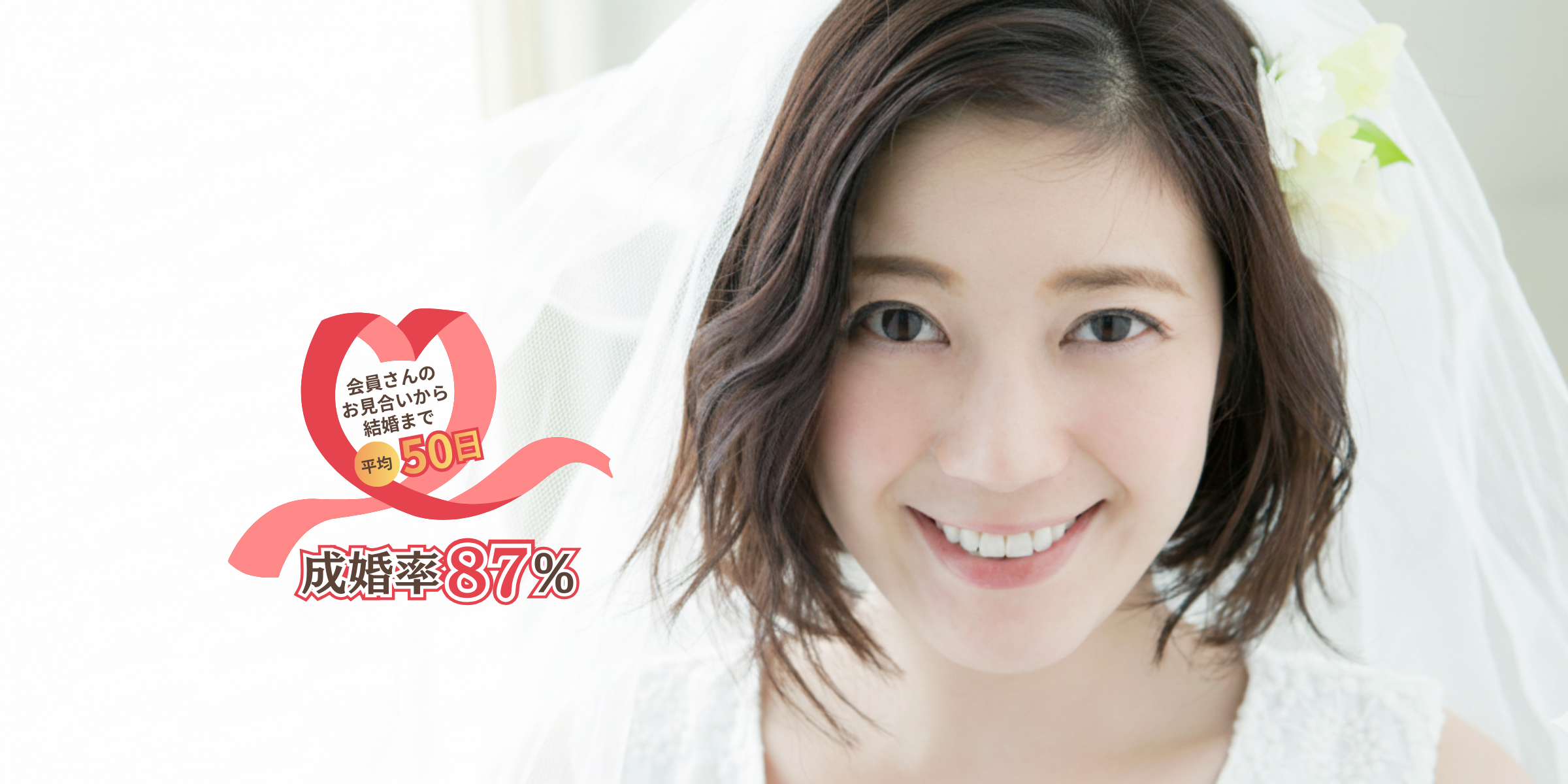 「出会いから50日。ご入会された87%がご成婚を決めた理由があります」「迷っている時間が、いちばんもったいない」